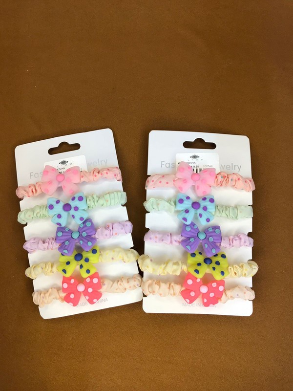 Elásticos coloridos: São elásticos de cabelo em várias cores vibrantes, muitas vezes com detalhes como laços, flores ou figuras temáticas.